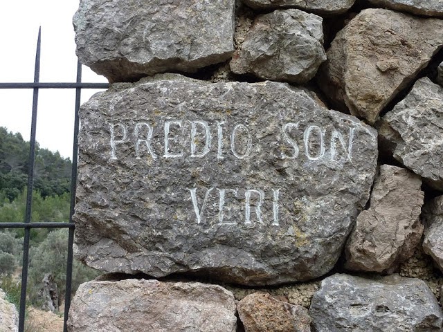 El caragolat camí ens aboca a una pista agrícola; deixam a la dreta un desviament que baixa a les cases, per ses Cuinetes. Ara ens pega el sol de valent per les marjades d'ufanoses oliveres.