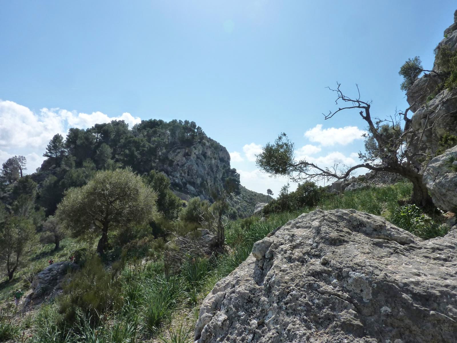 Mentre baixam per un coster molt pendent, gaudim de la imatge dels punxeguts puigs de Son Nassi (577 m) i el de Son Poc (491 m), el nucli de Bunyola i la gran mola de sa Comuna.
